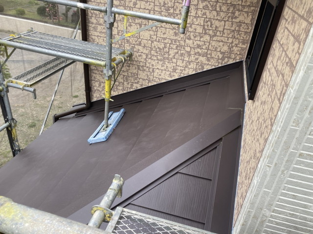 完成後は、下屋根全体がすっきりとした印象になり、建物全体の統一感も高まりました。
