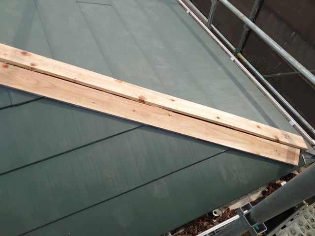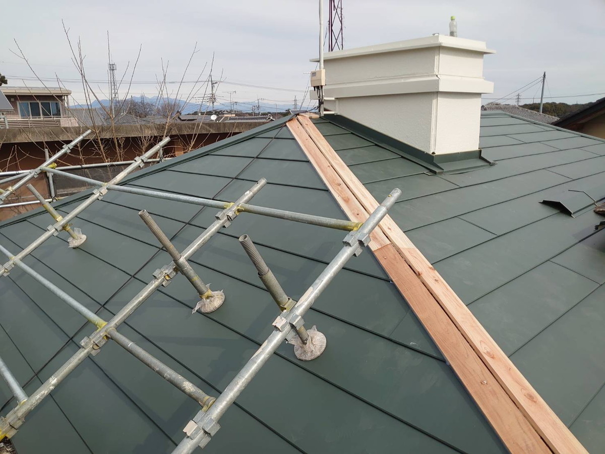 施工前は既存のコロニアル屋根の上に足場を設置し、安全対策を徹底したうえで工事を進めました。群馬県高崎市T様邸 コロニアル 横暖ルーフ 水温機 煙突群馬県高崎市T様邸 コロニアル 横暖ルーフ 水温機 煙突まず重要なのが棟部分の下地確認です。写真でも分かるように、棟下地の木材には劣化や隙間が見られたため、新しい下地材に交換し、しっかりと固定しました。