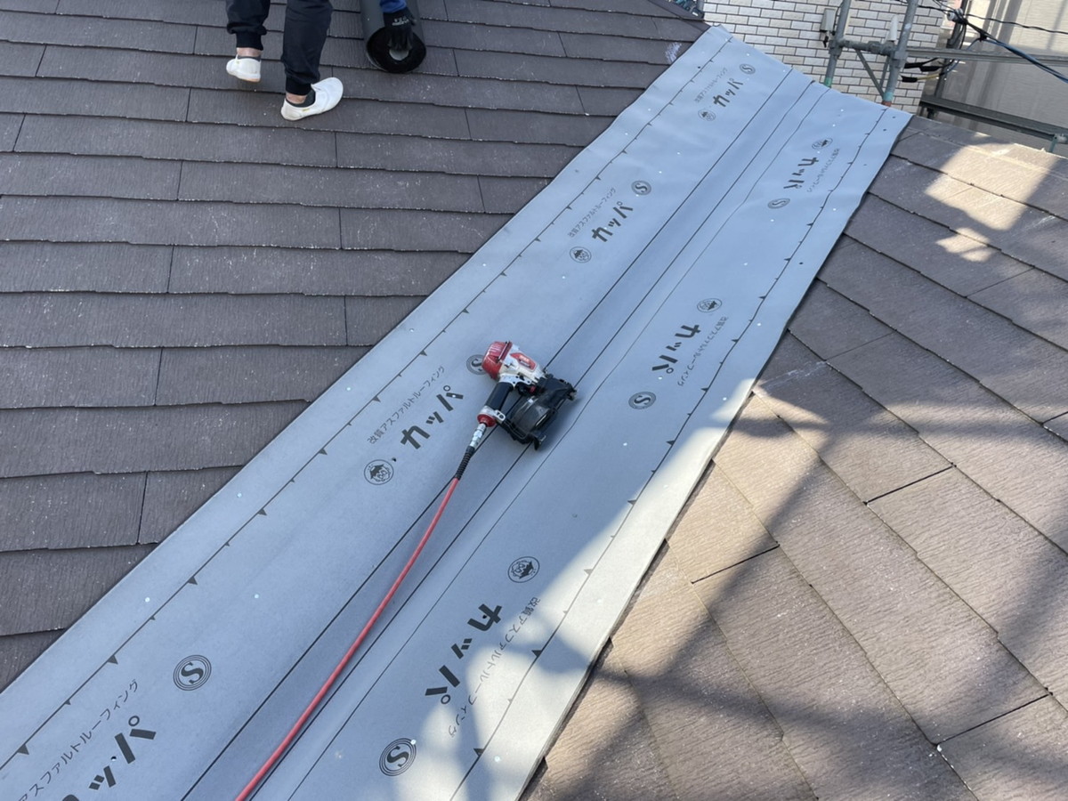 写真では、既存屋根の上に新しい屋根下地とルーフィングを施工している様子が確認できます。使用しているのは改質アスファルトルーフィングで、防水性・耐久性に優れ、屋根カバー工法では定番の材料です。シートは下から上へ、重ね代を確保しながら張り進め、タッカーや専用金具でしっかり固定します。この重ね方や固定位置が不適切だと、強風時にめくれたり、水の侵入経路を作ってしまうため、職人の技量が問われる工程です。