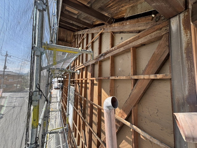 建物とブロック塀の間が狭く敷地内に足場が組めないので、道路占用許可をとり外側に足場を組ませていただきました。