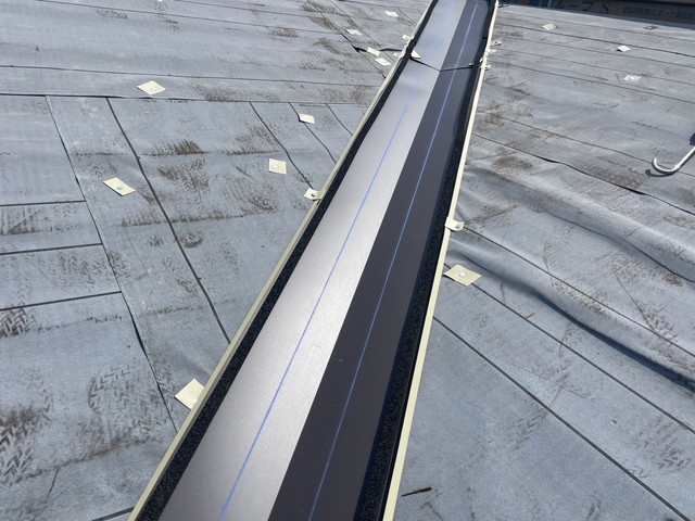 谷樋と言うくらいですから良く雨の通る道になりますので、谷板金の固定には直接穴を開けないように工夫しております。