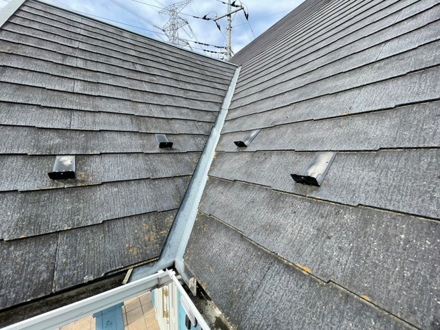 写真でも分かるように、スレートの重なり部分や棟・谷板金付近に傷みが見られ、早めの対策が必要な状態でした。