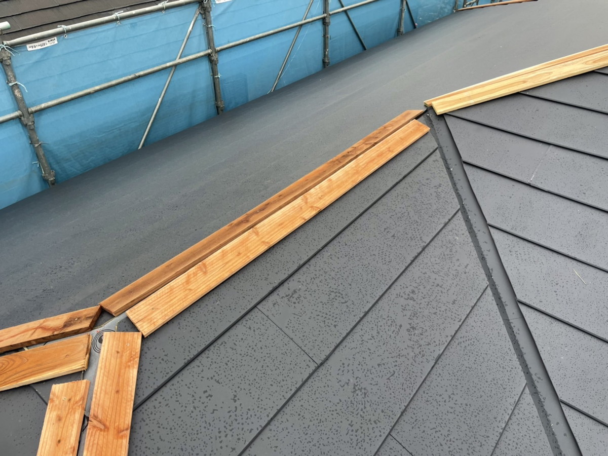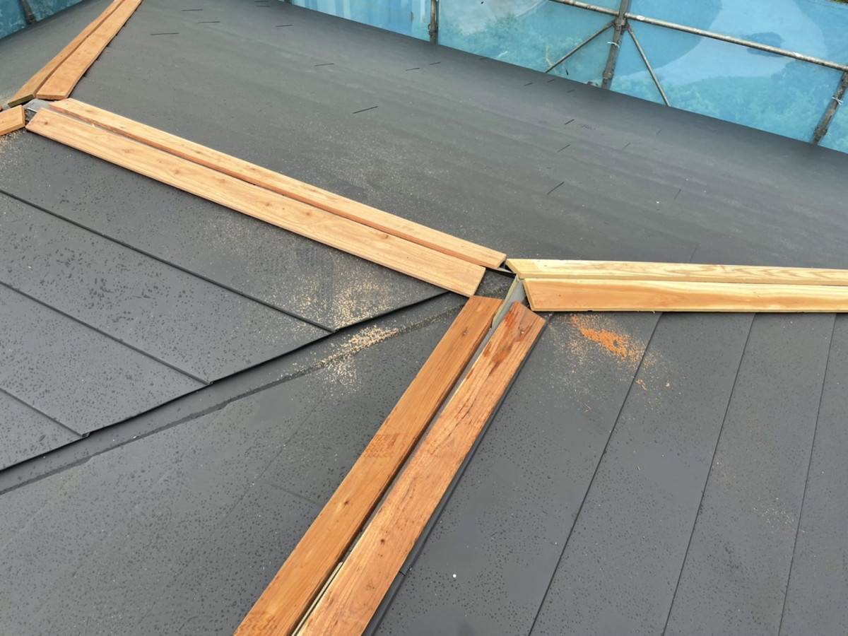 F様邸では、谷あり屋根のため、棟板金の下地施工を特に丁寧に行いました。写真のように、まずは棟部分に木製の下地材を設置し、しっかり固定できる土台を作ります。この下地が不十分だと、強風時に棟板金が浮いたり、ズレたりする原因になります。