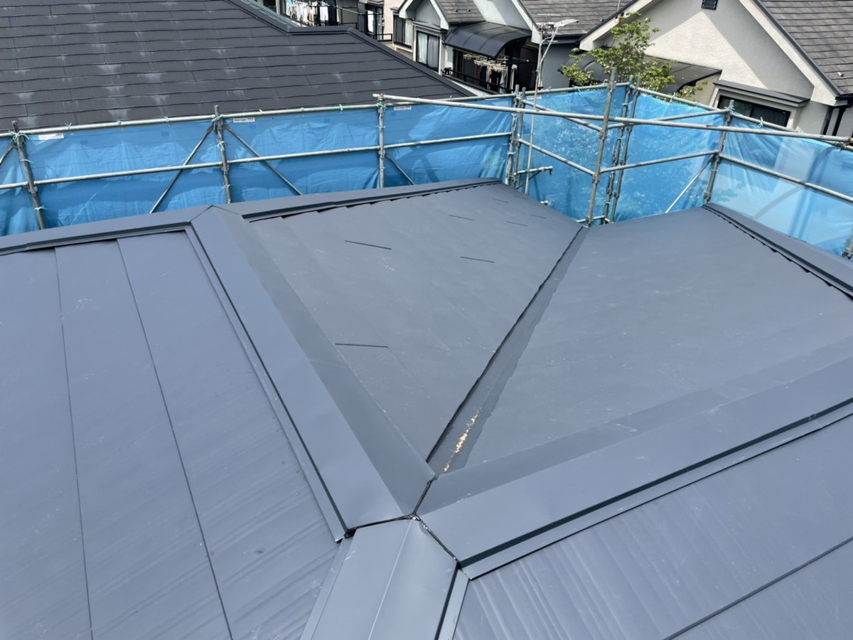 また、谷部分との取り合いでは、雨水の流れを妨げないよう下地の高さや配置を細かく調整。棟板金を取り付ける際も、重ね方向や納まりを確認しながら施工することで、見た目の美しさと防水性を両立させています。こうした一つひとつの工程が、長持ちする屋根につながります。