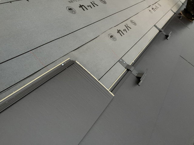 次に行ったのがルーフィング施工です。今回は防水性・耐久性に優れた改質アスファルトルーフィングを使用し、雨水の侵入をしっかりと防ぐ構造を作りました。